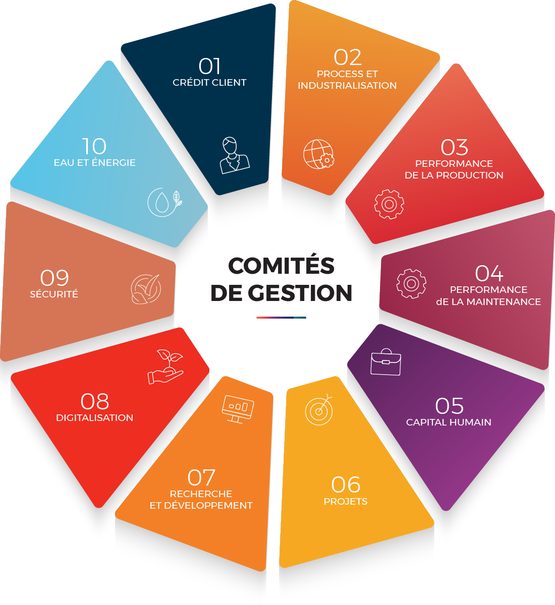 Les comités de gestion sont organisés autour de dix thématiques clés qui reflètent les priorités stratégiques de l’entreprise. Ils portent sur la gestion du crédit client, l’amélioration des procédés et de la production, ainsi que la performance de la maintenance. Ils mettent aussi en avant le développement du capital humain, la réussite des projets, la recherche et l’innovation, et la transformation digitale. Enfin, ils intègrent des volets essentiels liés à la sécurité au travail et à l’optimisation durable de l’eau et de l’énergie.